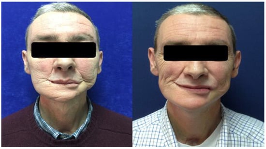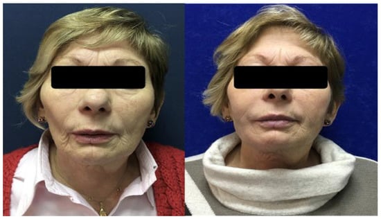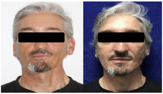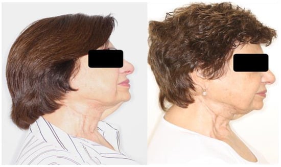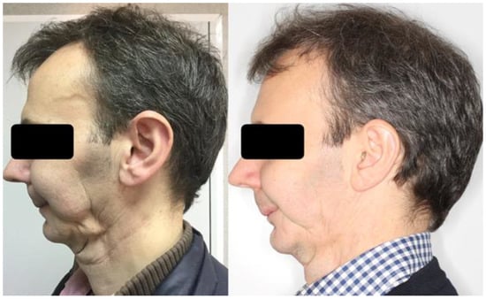 Esthetic improvement was obtained in 31 patients (77.5%), being significant in 7 of them (17.5%). In relation to functional alterations, there were three patients who scored 0 preoperatively. In the remaining 37 patients, functional improvement was found in 33 (89.2%), being significant in 11 of them (29.7%). One of the most widespread findings in the treated patients was clinical improvement in the quality of irradiated skin on the neck or face, with apparent improvement in blood supply, skin smoothness, function, and elasticity. The analysis of graft stability was performed clinically by evaluating the patient and analyzing the photographic documentation, showing a progressive volumetric decrease close to 50% of the injected volume in all patients. Details of treatment characteristics and outcome of the study patients are shown in Table 1. Figure 1, Figure 2, Figure 3, Figure 4 and Figure 5 show some representative cases. Postoperative photographs of these patients were obtained between 6 and 12 months of follow-up after the fat grafting procedure.
