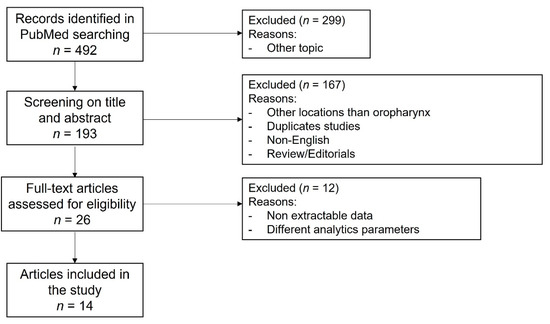 Following the search criteria, 492 papers were initially identified but only 193 were related to the topic of the study. After sorting and removing duplicates, the abstracts of the remaining papers were reviewed, 26 of which were retrieved and reviewed in detail. Twelve studies that did not satisfy the inclusion criteria were discarded [27,28,29,30,31,32,33,34,35,36,37,38]. Of these, nine were excluded because they did not report the outcome of OPSCC separately from other locations of HNSCC [27,28,29,30,31,32,34,37,38], and three because they did not report the NLR value [33,35,36]. Fourteen studies comprising 7647 patients with OPSCC were eventually selected in the analysis [13,14,15,16,17,18,19,20,21,22,23,24,25,26] (Figure 1). All studies were retrospective and of a high-quality with scores > 6 points on the NOS. Table 1 summarizes the main features of the selected studies and Supplementary Table S3 summarizes the key findings.