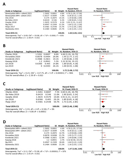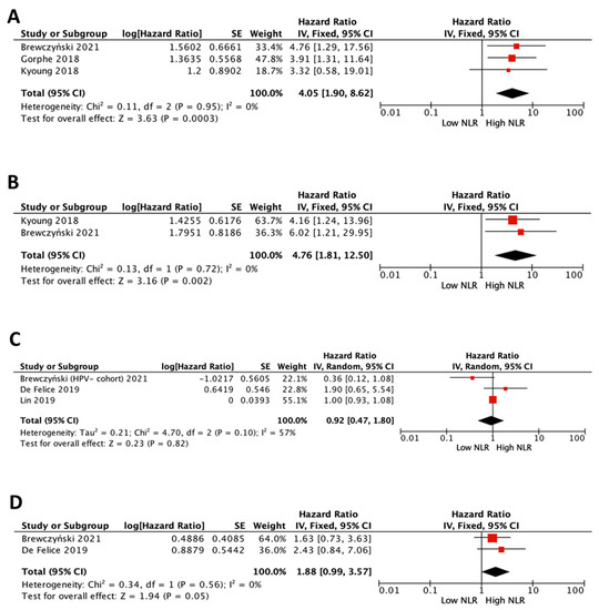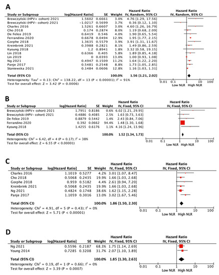 Taken together, the present meta-analysis and the aforementioned studies suggest that the effect of elevated NLR on prognosis is greater in HPV-positive than in HPV-negative OPSCC. Therefore, stratification according to HPV status is recommended for future studies.