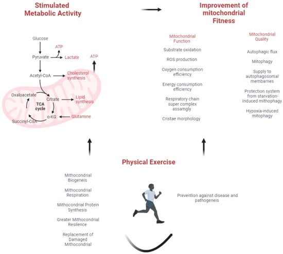 It was over a hundred years ago when Otto Warburg’s experiments on mitochondrial respiration first highlighted the vital role of mitochondria in eukaryotic cells [1]. In a healthy eukaryotic cell, mitochondria regulate cellular processes, such as metabolic adaptation, calcium homeostasis, and cell proliferation or death. They also participate in reactions, such as the tricarboxylic acid cycle (TCA), fatty acid oxidation (FAO), and oxidative phosphorylation (OXPHOS), which play a role in processes, such as ketogenesis, gluconeogenesis, heme biosynthesis, and Fe/S cluster formation [2]. Additionally, mitochondria contain their DNA, which can be mutated, partially deleted, or damaged due to epigenetic and evolutionary factors. Given the many roles of mitochondria, their potential dysfunction or alteration is closely linked to a wide range of diseases, including cancer. This review, therefore, focuses on metabolic health and the concept of mitochondrial fitness, and how physical exercise can be used as a preventive and adjunctive measure in mitochondrial disease and cancer.