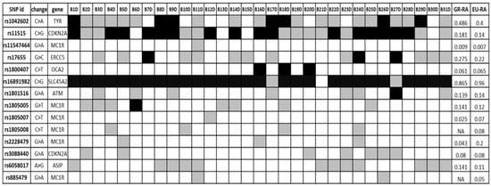 Germ-line SNPs putatively associated with melanoma risk; black = homozygous for melanoma risk-associated allele (RA), white = homozygous for reference allele, grey = heterozygous. GR-RA: Frequency of the risk allele in the Greek population, EU-RA: Frequency of the risk allele in the European population.