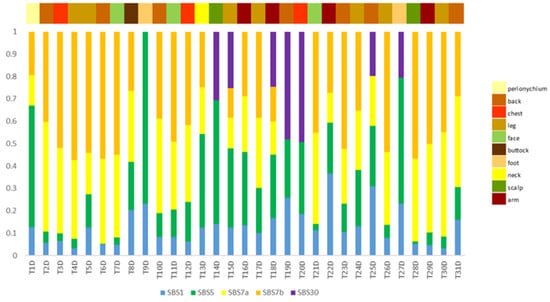 Mutational signatures per patient (n = 31). The identified signatures are colour-coded, and their proposed biological aetiology is as follows: SBS1: endogenous mutational process, spontaneous deamination of 5-methylcytosine; SBS5: unknown aetiology; SBS7a/b: exposure to ultraviolet light; SBS30: deficiency in base excision repair.