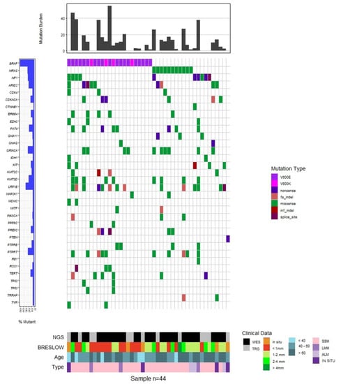 To understand the significance of the identified mutations and mutated genes, we first compared our data with the COSMIC database [,]. We selected the top-20 mutated cancer-related genes (referred to as census genes) recorded in COSMIC for melanoma, as well as 19 more genes targeted by the Oncomine melanoma panel, resulting in a total of 39 genes. Figure 3 illustrates the distribution of somatic variants in these genes, where the information for 34 genes is shown because 5 genes did not carry any variant. Forty-four out of forty-six samples are depicted in the Oncoplot since in two samples no variant was detected in these genes. Clinical details for each sample are presented, including Breslow thickness, age group at diagnosis and melanoma subtype (SSM, LMM, ALM, IN SITU). A large proportion (16/23, 69.6%) of BRAF-mutated melanomas were in situ or thin melanomas (<1 mm Breslow) and the majority (5/8, 62.5%) of patients aged under 40 carried a BRAF V600E mutation. In contrast, V600K was found only in older patients and three out of four cases were located in the head and neck region. In addition, BRAF V600E carrying melanomas were mainly nevi-related as fourteen out of nineteen cases (73.7%) were raised on pre-existing nevi in areas with intermittent UVR exposure. A detailed description of clinicopathological data in the different mutational subtypes is summarised in Supplementary Table S3.