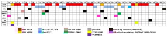 Regarding the prevalent melanoma-related mutated genes BRAF, NRAS and NF1, 38 known oncogenic mutations were found in all 46 melanoma samples. All of them were mutually exclusive, except one sample that carried an NRAS Q61K substitution along with an NF1 nonsense mutation. Regarding BRAF, twenty-three melanomas carried mutations at the hotspot position V600. Specifically, 18 melanomas carried the chr7:140753336 A>T SNV, resulting in a V600E substitution, one melanoma carried the MNV chr7:140753335 CA>TT, also resulting in a V600E substitution, and four melanoma samples carried the chr7:140753336 MNV AC>TT, which results in a V600K amino acid change. One sample was found to carry the BRAF V600E mutation co-occurring with a BRAF R347Q substitution. This specific variant has been previously reported in nevus sebaceous [], a class of epidermal nevi, as well as in a few cases of non-skin cancers, as detected by searching the cBioPortal (https://www.cbioportal.org, accessed on 2 September 2022) and GDC Data Portal (https://portal.gdc.cancer.gov, accessed on 2 September 2022) platforms. Ten melanomas carried mutations in the Q61 position of NRAS (5 Q61K, 2 Q61L, 2Q61R and 1 Q61H) and one sample carried the rare, but likely, oncogenic substitution A59T [,]. Regarding NF1, three nonsense mutations were identified.