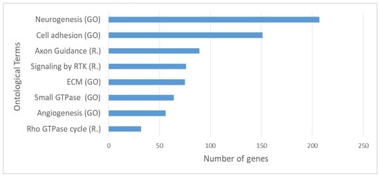 In order to gain insights into the molecular mechanisms that are related with the genes carrying somatic variants, we performed functional enrichment analysis exploiting the BioInfoMiner platform (https://e-nios.com/products/bioinfominer/, accessed on 22 July 2022; []). Aiming to limit our analysis to genes carrying putatively oncogenic alterations, we prioritised the identified variants combining information from different levels, as described in Materials and Methods, resulting in a total of 1297 genes that represent candidate genes with altered function. Functional enrichment analysis revealed significantly enriched GO and Reactome terms encompassing key biological processes. The complete list of enriched terms is documented in Supplementary Tables S4 and S5. Among the highest ranked of these, there were ontological terms related to extracellular matrix organisation, cell adhesion and cell–cell communication, developmental processes (highly represented by terms related to neurogenesis), axon guidance, signalling by Receptor Tyrosine Kinases (RTKs) and small GTPases, and angiogenesis (Figure 5).