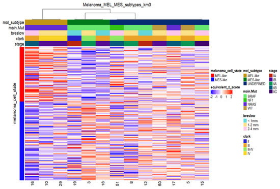 Heatmap of relative mRNA expression of MEL-like and MES-like associated genes in melanoma samples (n = 13) with sample cluster assignments by k-means clustering. K-means in columns (melanoma cases) identified three distinct groups based on the expression profile of the MEL-like (red vertical bar on the left) and MES-like gene sets (blue vertical bar on the left). Gene expression values were z-transformed and are coloured red for high expression and blue for low expression, as indicated in the scale bar. Clinical (Breslow; Clark and stage) and molecular information (mutated driver genes) of samples is added at the top as colour bars.