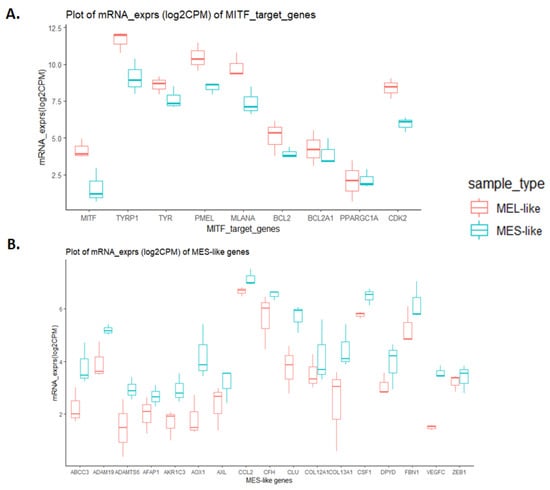 Boxplot diagrams of expression levels of classic melanocytic and mesenchymal gene markers in melanoma samples. Log2CPM mRNA expression values of MEL and MES groups were used. Boxplots indicate the median (thick bar), first and third quartiles (lower and upper bounds of the box, respectively), and lowest and highest data value within 1.5 times the interquartile range (lower and upper bounds of the whisker). Boxplot diagrams of expression levels of MITF target genes, highly expressed in MEL-like samples (A) and of mesenchymal gene markers, highly expressed in MES-like samples (B).
