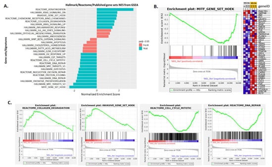 Gene set enrichment analysis (GSEA) results of MES-like versus MEL-like melanoma sample comparison. (A). Bar plot showing selected top enriched gene sets/pathways as derived from GSEA based on the differential expression analysis of MES-like versus MEL-like tumour melanoma samples. Bars in blue indicate significant enrichment at p-adj (FDR) <5%, bars in red represent gene sets with FDR >5% and a nominal p-value < 5%. A positive normalised enrichment score (NES) value indicates enrichment in the MES-like phenotype, a negative NES indicates enrichment in the MEL-like phenotype. (B). Gene set enrichment plot of MITF melanoma signature (Hoek et al. 2008), enriched in MEL-like vs. MES-like GSEA showing the profile of the running ES and positions of gene set members on the log2FC (Fold Change) rank-ordered list. The signal2Noise metric is graphed for each correlated gene in the ranked dataset. Heat map of 44 MITF signature genes (for each phenotype in the comparison of MES-like (grey column) vs. MEL-like (orange column). Normalised expression values are represented as colours and range from red (high expression), pink (moderate), light blue (low) to dark blue (lowest expression). (C). Four GSEA enrichment plots for representative molecular signatures (Cell-cycle, DNA-repair, Collagen-degradation, Tumour invasive signature) enriched in MES- and MEL-like tumours are shown. The top part of each GSEA plot shows the running enrichment score for validated genes specific for a particular pathway/signature as it moves down the ranked list. The bottom part of each plot shows the value of ranking matrices as it moves down the list of ranked genes. The red horizontal bar that terminates with a blue colour indicates a shift from positively correlated genes (red) to negatively correlated genes (blue). The y-axis represents enrichment score (ES) and the x-axis shows differential expressed genes (vertical black lines) represented in different pathways.