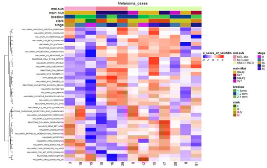 Finally, we carried out another systematic approach to test whether our tumour sample characterisation, which was based on clustering methods by profiling the MES- and MEL-like gene signatures, is also validated in single-sample GSEA (ssGSEA), further highlighting their heterogeneity at a functional level (Figure 9). This analysis supported the characterisation of MEL- and MES-like cases, as gene sets such as that of MITF by Hoek et al. were clearly positively enriched only in MEL-like samples. These samples were also characterised by enriched pathways including DNA repair, UV response and Myc-targets. Regarding the pathways enriched in MES-like samples, they include KRAS signalling, inflammatory response, Hoek et al.’s invasive signature and the epithelial to mesenchymal transition process. Sample 19 presents a deviation from the other two MES-like samples (3 and 18) concerning these positively enriched pathways, but as far as the pathways with relevantly low enrichment are concerned, it is clearly clustered with the MES-like phenotype (Figure 8). Regarding samples 17 and 50, which resembled the “neural-plastic” (NPLAS) subtype of Andrews et al. [], they present a relatively high enrichment of pathways, including TGF-b signalling, UV response, P53 pathway and the invasive gene set of Hoek et al. [], while processes related to cell cycle and proliferation are negatively enriched.
