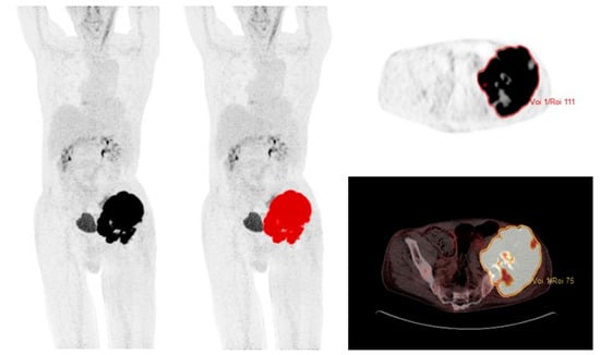 - Andersen, K.F.; Fuglo, H.M.; Rasmussen, S.H.; Petersen, M.M.; Loft, A. Volume-Based F-18 FDG PET/CT Imaging Markers Provide Supplemental Prognostic Information to Histologic Grading in Patients with High-Grade Bone or Soft Tissue Sarcoma. Medicine 2015, 94, e2319. [Google Scholar] [CrossRef]