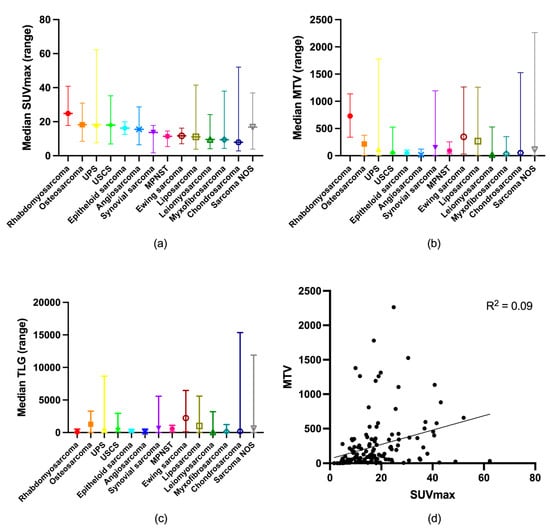 Distribution of (a) SUVmax; (b) MTV2.5; and (c) TLG2.5 according to sarcoma type. (d) Correlation between SUVmax and MTV2.5.