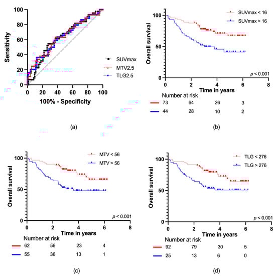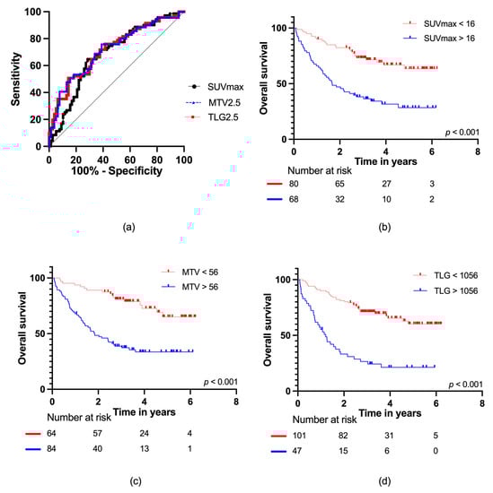(a) ROC curves for SUVmax, MTV2.5, and TLG2.5 for all patients; Kaplan–Meier survival curves with number at risk at baseline, two, four, and six years for (b) SUVmax; (c) MTV2.5; and (d) TLG2.5.