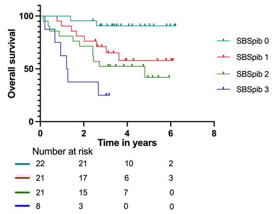 Kaplan–Meier survival curves with number at risk at baseline, two, four, and six years according to the Sarcoma Biomarker Score pet imaging and blood (SBSpib) model in patients with localized disease.