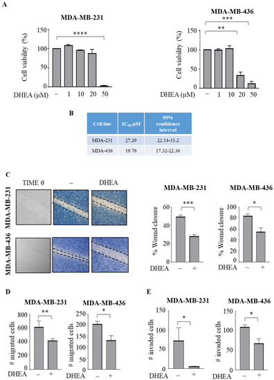 DHEA treatment reduces breast cancer cell motility and invasion. (A) MTT (3-(4,5-Dimethylthiazol-2-yl)-2,5-Diphenyltetrazolium Bromide) assay in MDA-MB-231 and MDA-MB-436 breast cancer cells treated as indicated for 24 h. (B) IC50 values of DHEA in MDA-MB-231 (MDA-231) and MDA-MB-436 (MDA-436) cells from MTT growth assay after 24 h. (C) Wound healing assay in MDA-MB-231 and MDA-MB-436 cells treated with vehicle (−) or DHEA 10 µM. Time 0 is shown. Pictures are representative of three independent experiments. Boyden chamber transmigration (D,E) invasion assays in MDA-MB-231 and MDA-MB-436 cells treated with vehicle (−) or DHEA 10 µM within 24 h. The values represent the mean ±SEM of three different experiments. * p < 0.05; ** p < 0.005; *** p < 0.0005; **** p < 0.0001.
