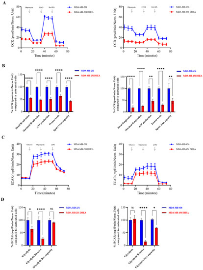 DHEA diminishes oxygen consumption rate and extracellular acidification rate in MDA-MB-231 and MDA-MB-436 breast cancer cells. The Seahorse XF96 analyzer was employed to determine the mitochondrial and glycolytic profile of MDA-MB-231 and MDA-MB-436 breast cancer cells treated with DHEA 10 μM for 24 h. (A) OCR profile. (B) Respiration (basal and maximal), as well as ATP levels, Proton Leak, and Spare respiratory capacity. (C) ECAR profile. (D) Glycolysis, Glycolytic Reserve, and Glycolytic Reserve Capacity. The values represent the mean ± SEM of three different experiments. * p < 0.01, ** p < 0.001, **** p < 0.00001, ns = not significant.