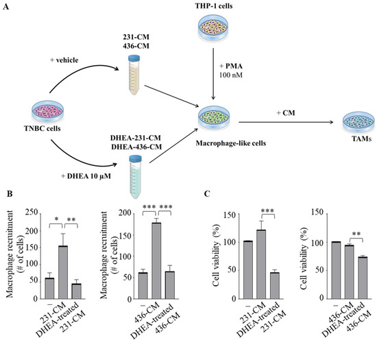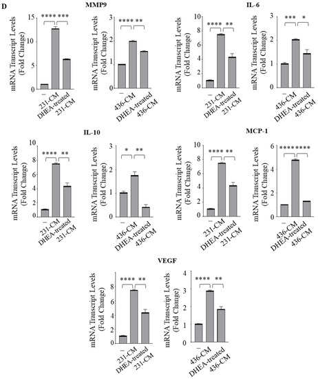MDA-MB-231 and MDA-MB-436 cells were plated in 5% charcoal-stripped serum medium (2.5 × 106) in a 10 cM dish. Then, cells were washed twice and treated with vehicle or DHEA 10 µM for 24 h in a 1% charcoal-stripped serum medium. CM was collected, centrifuged, and used in co-culture experiments.
