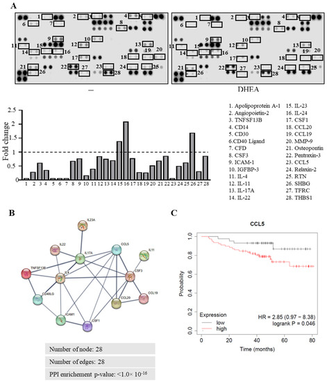 Effects of DHEA on cytokine secretion profile of TNBC cells. (A) Human cytokine array of the secreted proteins by MDA-MB-231 breast cancer cells treated with vehicle (−) or DHEA 10 μM. Results are presented as fold-over to vehicle-treated cells. (B) Protein–protein interaction (PPI) network visualized by STRING 11.5 online tool (https://string-db.org/, accessed on 28 July 2022). The nodes indicate proteins, and the edges indicate the number of interactions. Disconnected nodes are hidden, and only interactions with a high confidence score of >0.7 are shown. (C) Kaplan-Meier survival analysis relating CCL5 levels (using the median of expression as cutoff) and overall survival in TNBC patients. Hazard ratio (HR) and p-value are shown.