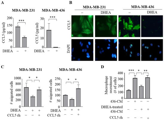 To validate the results of the cytokine array analysis, we analyzed the secretion of CCL5 in the collected CM from both TNBC cells treated with DHEA by ELISA. Interestingly, protein levels of CCL5 were 143.47 ± 15.05 pg/mL and 17.9 ± 6.88 pg/mL in MDA-MB-231 and MDA-MB-436 cell-derived CM, respectively. Compared to basal levels, DHEA treatment markedly reduced CCL5 concentrations at 51.3 ± 2.84 pg/mL and 0.5 ± 0.01 pg/mL in MDA-MB-231 and MDA-MB-436 cell-derived CM, respectively (p < 0.0005) (Figure 5A). Accordingly, the reduction in CCL5 expression induced by DHEA in both TNBC cells was confirmed by evaluating protein levels using immunofluorescent staining (Figure 5B).