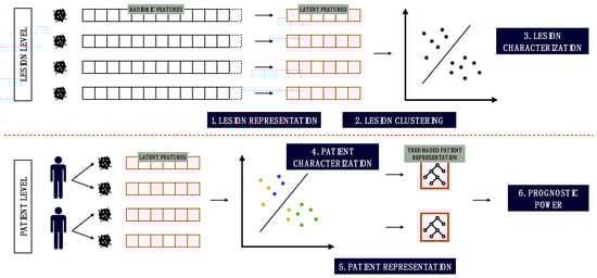 Flowchart of the analyses: at the lesion level, lesions are (1) represented through an agnostic dimensionality reduction of radiomic vectors and (2) clustered in groups, which are further analyzed with clinical variables (3). At the patient level, patients are qualitatively described in terms of intra-patient heterogeneity (4), represented through trees (5), and quantitively analyzed with prognostic purposes (6).
