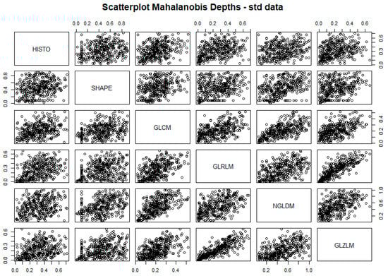 Data depth was applied for radiomic data representation in this analysis. A data depth is a way of measuring how deep (central) a given observation is with respect to the peer observations. It can be thought of as a multivariate generalization of boxplots. Indeed, when analyzing a boxplot of a variable we are assessing the relative position of each sample in the context of the other samples’ distribution: samples close to the median values are typical samples and are more probable to be found in the distribution. Contrary to this, the greater the distance from the central values the less typical they are, indicating they are rarely observed within the phenomenon under analysis (outliers). The same approach can be extended to observations considering a higher number of variables, and the measure of the centrality/outwardness of data points is called the depth of the points. Indeed, depths allow ranking of objects characterized by a number of features . Several definitions of data depth—such as Mahalanobis depth, Halfspace (or Tukey) depth, projection depth, and spatial depth—are available in the literature [16,17,18] and their properties were reviewed for radiomic data representation in our context. Exploratory analyses are described in Supplementary Figure S1.