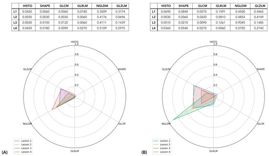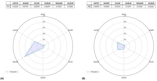 Mean radiomic profile of the two classes of lesions. In (A) the Class 1 radiomic template and in (B) the Class 2 radiomic template are displayed. The mean depth measure values are listed in the tables and graphically represented in the spider plots.