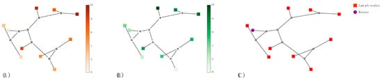 A patient tree-based representation. Lesions are colored according to biological characterization, namely (A) their standard uptake values (SUV_max), (B) total lesion activity, TLA, and (C) tissue of their sites, such as proximal and distant lymph nodes (squares) or skeleton (circles).
