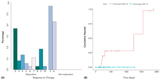 Best cutoff value for Davies–Bouldin-based number of phenotypes to discriminate between responder and not responder patients: (A) barplot of patient proportion; (B) stratified Kaplan–Meier.