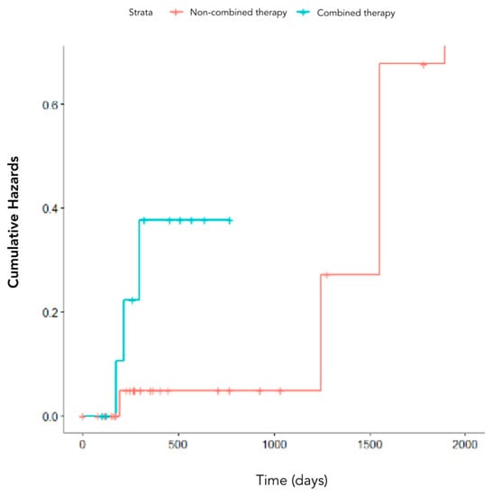 Kaplan–Meier cumulative hazards of patients stratified according to the combination of treatments, i.e., patients who underwent one (blue curve) or more than one therapy type (red curve).