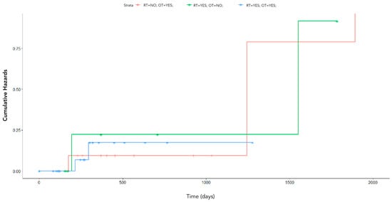 Kaplan–Meier cumulative hazards of patients stratified according to type of treatment, i.e., patients who underwent hormonotherapy (red curve), radiotherapy (green curve), or both (blue curve).