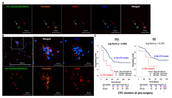 Double positive CTC, CTCM and CTC cluster. (A) Representative double-positive epithelial and mesenchymal CTCs (white arrow) and (B) mesenchymal CTCs (red arrows) in cluster enriched from the pre-surgery blood of ESCC patient T130. (C) Kaplan–Meier curve analysis indicated a shorter PFS and a trend of shorter OS between patients with versus without pre-surgery CTC clusters. PFS: progression-free survival, OS: overall survival.