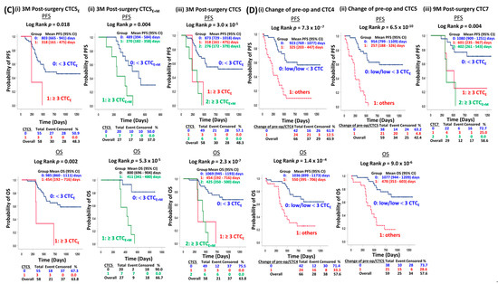 Patients with a high CTC level (≥3 epithelial CTC4E) at 1-month post-surgery showed a marginal trend of shorter PFS (p = 0.058), but no significant difference for the OS (p = 0.24) compared to those patients with a low CTC level (<3 CTC4E) (Figure 3B(i)). Serial epithelial CTC analysis at 3-month post-surgery indicated that patients with a high epithelial CTC level (≥3 CTC5E) were significantly associated with shorter PFS (p = 0.018) and OS (p = 0.002) (Figure 3C(i)), compared to those with a low epithelial CTC level (<3 CTC5E). The utilization of vimentin as a mesenchymal marker for CTC enumeration at 1-month and 3-month post-surgery enhanced the prognosis and risk stratification, as more patients carrying aggressive CTCs missed by epithelial markers were identified. At 1 month post-surgery, the ten patients with a high total CTC level (≥3 CTC4E+M) had a significantly shorter PFS (p = 0.002) and OS (p = 0.014) (Figure 3B(ii)). At 3-month post-surgery, the seven patients with high total CTC levels (≥3 CTC5E+M) had a significantly shorter PFS (p = 0.004) and OS (p = 5.3 × 10−5) (Figure 3C(ii)). For risk stratification, patients with a low (<3 CTC4E/CTC5E), high (≥3 CTC4E/CTC5E) epithelial CTCE, and high total CTCE+M (≥3 CTC4E+M/CTC5E+M) were categorized into low-risk group 0, and high-risk groups 1 and 2, respectively. The high-risk groups 1 and 2 at 1-month post-surgery had a significantly shorter PFS (p = 3.2 × 10−5) and a trend of shorter OS (p = 0.069) (Figure 3B(iii)). The high-risk groups 1 and 2 at 3-month post-surgery had a significantly shorter PFS (p = 3.2 × 10−5) and OS (p = 2.3 × 10−7) (Figure 3C(iii)). The best risk stratification parameters were based on the combined changes of pre-surgery/CTC4 and pre-surgery/CTC5. Patients remained low (<3 CTCE) CTC status at both pre-surgery/CTC4 (p = 7.3 × 10−7; p = 1.6 × 10−4) (Figure 3D(i)) and pre-surgery/CTC5 (p = 6.5 × 10−10; p = 9 × 10−6) (Figure 3D(ii)) with a statistically significant longer PFS and OS compared to other combinations of change. At 9-month post-surgery, when we considered a similar risk stratification strategy of patients into three risk groups, the high-risk groups 1 and 2 at CTC7 had a significantly shorter PFS (p = 0.004) compared to risk group 0 (Figure 3D(iii)). The current prospective longitudinal serial CTC monitoring along the course of curative treatment findings first suggests the clinical utility of prognostication and risk stratification of the combined changes of CTC status at pre-surgery/1-month post-surgery and pre-surgery/3-month post-surgery, and post-surgery follow-up timepoints at 1-, 3-, and 9-month status for patients treated by surgery with and without neoadjuvant treatment.