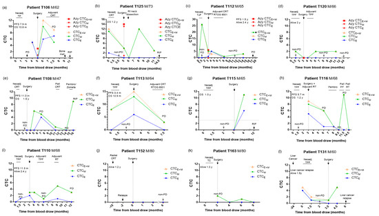 Imaging and traditional clinical evaluation are insufficient for independent prediction of treatment outcomes. Earlier ESCC CTC studies suggested CTC detected before and after treatment as independent predictors [8,9,10,11,17,51]. Our findings now demonstrate that real-time longitudinal monitoring of epithelial and mesenchymal CTC changes and unfavorable CTC status in multiple timepoints at baseline, pre- and especially, 1-month, 3-month, and 9-month post-operation, are predictive for recurrence and poor prognosis. CTC analysis of twelve patients in surveillance of neoadjuvant CTRT, surgery, and adjuvant CTRT is shown in Figure 4. The AVB CTC levels in four patients are also shown in Figure 4a–d. For instance, patients T106 (Figure 4a), T125 (Figure 4b), and T112 (Figure 4c) had a high level of pre-surgery CTC, AVB CTC, and post-surgery CTC; they died early or with early relapse with poor prognoses. Patient T120 (Figure 4d) with favorable CTC levels at multiple timepoints, including pre-III, pre-surgery (both PB and AVB), 3M, and 8M post-surgery, along with treatment, remained progression-free and alive. For six patients developing drug resistance to treatment and relapse, T106 (Figure 4a), T112 (Figure 4c), T108 (Figure 4e), T113 (Figure 4f), T116 (Figure 4h), and T110 (Figure 4i) the unfavorable total CTCE+M status in PB was concordant to PD detected by imaging. Favorable CTC status in PB was observed for three patients with stable conditions responding to the CRT treatment when the imaging results were non-PD, T120 (Figure 4d), T152 (Figure 4j), and T163 (Figure 4k). However, the CTC counts in PB may not always be consistent with the imaging results. During post-surgery follow-up, when the imaging result was not available, the unfavorable total CTCE+M in PB was elevated 8–10 months in two patients, T125 (Figure 4b) and T115 (Figure 4g), before they died early with OS time of 1.2 and 1 year. For patient T131 with liver cancer two years before ESCC, the unfavorable CTCE+M elevated 1.5 months before the liver cancer relapse, while the ESCC primary tumor was responding (Figure 4l). No CTC was detected at PD of patient T108 at 14 months and T116 at 9.5 months (Figure 4h). This may be partially attributed to the heterogeneity of an aggressive subpopulation of CTCs being missed with the current panel of markers used for enumeration.