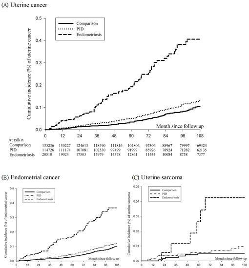 In 2016, the age-standardized incidence rate of Taiwanese women who suffered from cancer of the uterine corpus was reported to be 12.99 per 100,000 women subjects according to the annual registry report from Health Promotion Administration in the Ministry of Health and Welfare [15]. Uterine cancer is the most common gynecological cancer among Taiwanese female individuals. Most uterine corpus cancers are endometrial cancers, which originate from the uterine epithelium, while less than 2% are uterine sarcomas, which stem from the stromal tissues [16,17]. Previous results, investigating whether endometriosis or PID increases the risk of uterine cancer, were conflicting. A positive relationshiop between endometriosis and endometrial cancer has been revealed, but display a wide variation [18,19]. Among these studies, Kok et al. reported a high risk, four-fold increased odds risk [OR = 4.05, 95% confidence interval (95% CI) = 1.20 to 13.66] in 2266 endometriosis Taiwanese women with short claims data between 2003 and 2005 in a retrospective cohort study [20], whereas Rowlands et al. demonstrated a lowest OR of endometrial cancer 1.47 (95% CI = 1.00 to 2.17) in 128 endometriosis Australian women, which disappeared completely when the risk of uterine cancer in the first year after endometriosis diagnosis was excluded in a case-control study [19], suggesting a potential for increased detection among women with endometriosis, rather than a true association. Furthermore, Saraswart et al. also found no relationship between them in a retrospective cohort study [21]. With regard to the relationship between PID and uterine cancer, Yang et al. conducted a population-based retrospective cohort study and revealed an increased risk of endometrial cancer, whereas only PID patients who were followed for <2 years or were >50 years had a significant difference [22]. In contrast, Shen et al. also suggested no increased risk for uterine cancer in PID patients in a population-based retrospective cohort study [23]. It is very important to compare and delineate the associations among endometriosis and PID, as well as uterine corpus cancer, to determine which of these inflammatory diseases really leads to increased uterine cancer risk, which no studies have investigated thus far because these relationships may affect the positive treatment attitude towards these diseases to prevent from this most common gynecological cancer. Most carcinogens have an incubation period to develop malignant tumors, and the risk of time varying effect of the common gynecological inflammatory diseases, endometriosis, or PID on uterine cancer may change with time and may not be linear with time, therefore it is also import to investigate the risk of uterine cancer with time after diagnosis of these inflammatory diseases.