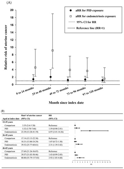 We hypothesized that the impacts of endometriosis and PID on uterine cancer are different, and the disease duration may have impacts, and a period of time is needed to result in the highest risk of uterine cancer. Time varying effect on uterine cancer development was estimated after endometriosis and PID diagnosis, as compared to the comparison controls on the same index date, which was defined as one year after endometriosis and PID diagnoses. To our knowledge, no study compares the risks of uterine cancer between patients with endometriosis and those with PID in different age groups. Furthermore, the relative risk (RR) of older women was inferred to be different from that of younger individuals.