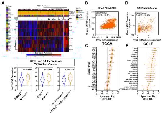 The evaluation of transcriptomic data for 1037 cancer cell lines representing 22 different anatomical sites from the Cancer Cell Line Encyclopedia (CCLE) also showed KYNU mRNA levels to be positively correlated (Spearman ρ: 0.36 (95% CI: 0.31–0.42); 2-sided p < 0.0001) with the 11-gene NRF2 activation consensus signature (Figure 1D,E).