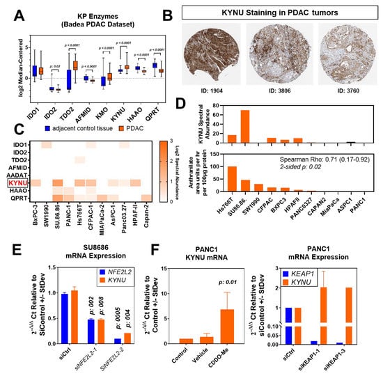 NRF2 regulates KYNU expression in pancreatic cancer cells. (A) mRNA expression of KP enzymes in pancreatic tumors and adjacent control tissues. The gene expression data were derived from the Badea study [10]. Statistical significance was determined by the 2-sided Wilcoxon matched-pairs signed rank test. (B) Representative immunohistochemical staining of KYNU in pancreatic tumors. Data were derived from the ProteinAtlas. (C) Protein abundance (spectral abundance) of KYNU in whole cell lysates of 11 pancreatic cancer cell lines analyzed by mass spectrometry. (D) Bar plots showing the association between whole-cell-lysate KYNU protein expression and rates (area units per hour per 500 µg of protein) of KYNU-derived anthranilate accumulation in the conditioned medium of the respective pancreatic cancer cell lines. (E) Relative mRNA expression of KYNU following siRNA-mediated knockdown of NFE2L2 in SU.86.86 pancreatic cancer cells. (F) Relative mRNA expression of KYNU following treatment of KYNU-low PANC1 pancreatic cancer cells with the NRF2 agonist CDDO-Me (left panel) or following siRNA-mediated knockdown of KEAP1 (right panel).