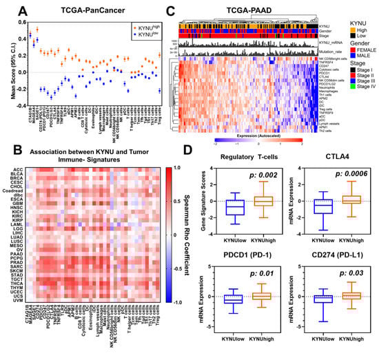 Association between tumoral KYNU mRNA expression and tumor immunophenotype. (A) Gene-based signature scores for immune cell infiltrates and immune checkpoint blockade-related genes across 9801 tumors from TCGA stratified into high (>median) or low (≤median) KYNU mRNA levels. For these analyses, cancer type was not considered. The immune signature scores were based on Bindea et al. [14] (B) Spearman correlation heatmap illustrating the association between tumoral KYNU mRNA levels and gene-based signatures of immune subtypes and immune checkpoint blockade genes across the 32 cancer types. (C) Heatmap depicting the relationship between KYNU mRNA expression and gene-based signatures of immune subtypes in the TCGA-PDAC dataset. Immune subtypes that were significantly differential (Student’s t-test 2-sided p < 0.05) between KYNU-high (>median) and KYNU-low (≤median) tumors are shown. (D) Box and whisker plots showing gene signature scores for Tregs and mRNA levels of CTLA4, PDCD1 (PD-1), and CD274 (PD-L1) in PDAC tumors with KYNU mRNA levels in the bottom 25th percentile and top 25th percentile.