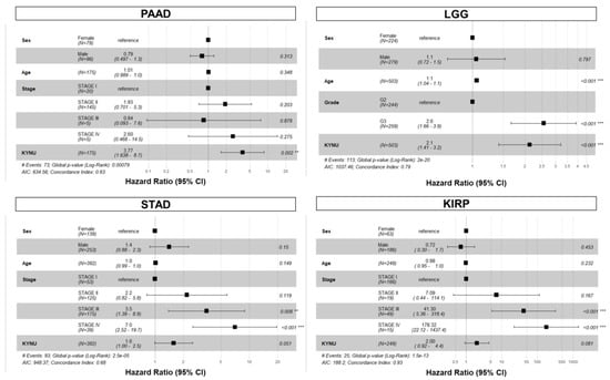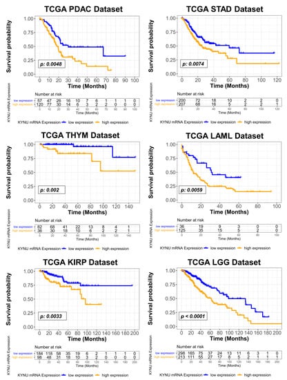 We further evaluated the association between tumoral KYNU mRNA expression and overall survival for the 32 cancer types in TCGA datasets. In addition to LUAD, univariable Cox proportional hazard models demonstrated elevated tumoral KYNU gene expression to be prognostic for poor overall survival in thymoma (THYM), acute myeloid leukemia (LAML), low-grade glioma (LGG), kidney renal papillary cell carcinoma (KIRP), stomach adenocarcinoma (STAD), and PDAC (Table A1 in the Appendix A). In multivariable Cox proportional hazard models, considering sex, age, and tumor stage or grade as co-variables, elevated tumoral KYNU mRNA expression yielded hazard ratios (HR) per log10 unit increase of 3.77 (95% CI: 1.64–8.70), 1.60 (95% CI: 1.00–2.50), 2.10 (95% CI: 1.41–3.20), and 2.00 (95% CI: 0.92–4.40) for PDAC, STAD, LGG, and KIRP, respectively (Figure 4). Multivariable Cox Proportional Hazard models for THYM and LAML were not performed due to limited clinical information. The assumptions of Cox proportional hazard were met in our models. Kaplan–Meier curves showed that elevated tumoral KYNU mRNA levels above an optimal cutoff point were associated with poor overall survival for THYM, LAML, KRIP, STAD, and PDAC (Figure 5).