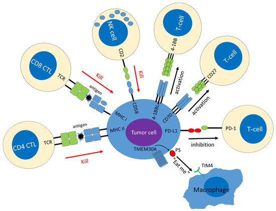 Recently, Ennishi et al. discovered TMEM30A was mutated in 5–10% of DLBCL, and most of them resulted in loss-of function of TMEM30A [56]. TMEM30A encodes the beta-subunit of phospholipid flippase (P4-ATPase), which regulates translocation of phosphatidylserine (PS) from the outer to the inner leaflet of the plasma membrane, maintaining an asymmetric distribution of the phospholipid. TMEM30A is one of the main players regulating the “eat me” signal that promotes phagocytosis of macrophage. TMEM30A loss-of-function enhances cell surface BCR dynamics facilitating more rapid B-cell responses, while it also increases tumor-infiltrating macrophages, suggesting TMEM30A loss of function is associated with a primed microenvironment for phagocytosis [56]. The presence of TMEM30A mutations was a strong favorable prognostic factor in R-CHOP therapy, especially in cases with bi-allelic alterations of TMEM30A. TMEM30A mutations were detected as a significant component of BN2 in LymphGen classification and C1 group described by Chapuy et al., both of which are genomic subtypes with favorable outcomes [7,10]. Notably, the authors also demonstrated that cytotoxic treatment (vincristine) or CD47 blockade had a significant therapeutic effect on TMEM30A-defficient tumor. These findings provide insight into the roles of “eat me” and “Don’t eat me” signals in DLBCL, enabling the development of novel therapeutic strategies [57]. Figure 1 presents these immune recognition molecules, and the co-stimulatory and co-inhibitory molecules are affected by genetic aberrations.
