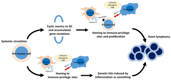Hypothetical scheme of diffuse large B-cell lymphoma (DLBCL) development in immune-privileged sites. Lymphoma-precursor cells, or “pre-tumor cells”, are thought to be present in systemic circulation. For example, memory B cells harboring Tbl1xr1 mutation exhibit skewed GC output and an increased tendency to reenter GC. These memory B cells appear to be prone to gaining additional somatic mutations. The immune–tolerogenic TME of immune-privileged sites may help “pre-tumor cells” with high-immunogenicity survive and proliferate, leading to lymphomagenesis (upper side). In DLBCL involving the central nervous system (CNS), “pre-tumor cells” harboring MYD88L265P are found in peripheral blood, and these cells may gain additional genomic hits after their homing to the CNS (lower side). This model may be applicable to a minority of intravascular large B-cell lymphomas with heterogeneous PD-L1 expression (lower side). Glectin-3 expressed on neurons and glial cells may also contribute to lymphoma precursor cells expansion by antigen-based selection. GC, germinal center; TME, tumor microenvironment.