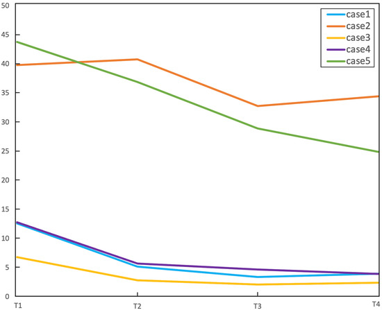 Tumor size over time for the five patients included in the study. Tumor size was measured as the product of the two greatest diameters on FLAIR images (cm2, y axis). Case 2 and 5 (described as possible ‘tumor-induced’ plasticity) presented larger tumor size at pre-op. T1 = baseline, T2 = post-op1 (4–8 months), T3 = post-op2 (10–14 months), T4 = post-op3 (16–23 months).