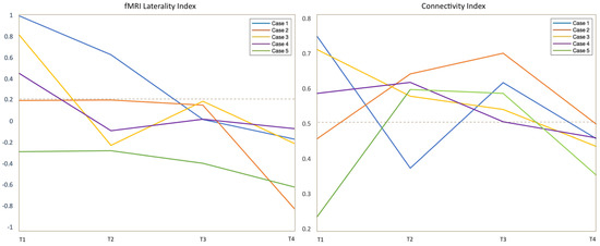 The left panel shows the fMRI laterality index for all cases across the four timepoints of the study (T1–T4). Values above 0.2 were considered left dominant. The right panel shows the connectivity laterality index for all cases across the four timepoints of the study (T1–T4). The closer the values are to 0.5, the more balanced is the connectivity between the two hemispheres. Values above 0.5 point to higher participation of the left hemisphere. LI obtained from tb-fMRI showed significant left-to-right trend in all patients across timepoints.