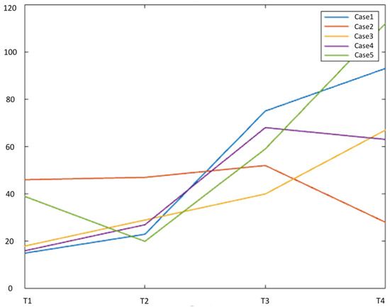 Graphical representation of the total number of intra- and inter-hemispheric connections between active fMRI clusters across the four timepoints of our study. Each case is represented as a colored line (legend in the figure). The number of links is depicted in the y-axis, while the timepoints are shown on the x-axis of the graph. All cases demonstrated an increased number of links from the first to the last timepoint, with the exception of case 2 (orange line).