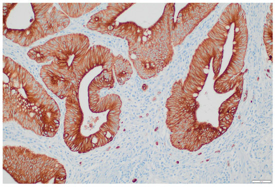 Recruited cases were from patients with primary surgery for an endoscopically unresectable adenoma which resulted in a pTis CRC. All pTis tumours were entirely submitted for histological examination and step sections were performed to ensure the absence of submucosal infiltration. All tumours invaded only the lamina propria, and none invaded either partially or totally the muscularis mucosae. Thus, although our tumours were in situ carcinomas according to the AJCC and the College of American Pathologists definition of pTis, i.e., “tumours involving the lamina propria and/or muscularis mucosae, but not extending through it (intramucosal carcinoma)” [12,13], none of our cases reached the muscularis mucosae. Inclusion criteria were patients older than 18 years-old with tumour positivity for CK 19 IHC. Exclusion criteria were CRC with pT stage higher than pTis, metastatic carcinomas, presence of other neoplasms, familial adenomatous polyposis, synchronous tumours, or chronic inflammatory bowel disease.