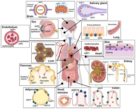 Aquaporins in the superfamily of major intrinsic proteins (MIPs) comprise 15 mammalian subtypes, including AQPs 0–12 in higher mammals and AQPs −13 and −14 in older lineages [42,43,44,45]. AQPs 0–12 are widely expressed throughout the human body (Figure 1) and particularly abundant in cell types involved in fluid or glycerol transport, including eye lens, renal duct cells, epidermal cells, choroid plexus and astrocytes, adipocytes, hepatocytes and the endothelial cells constituting blood and lymphatic vessels [46,47,48,49,50,51,52,53,54,55,56,57].