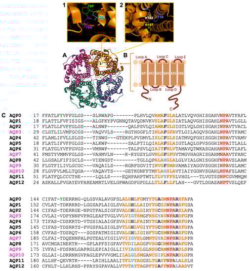 Aquaporin channels comprise four subunits, each with six transmembrane domains showing well conserved amino acid sequences that carry signature motifs, as well as key differences which enable functional specializations (Figure 2). Water pores are present in each monomer, but tetrameric assembly is a prerequisite for water transport efficiency, structural stability and membrane localization. Tetramers in membranes (Figure 2A) in some AQP classes can aggregate into higher-order arrays stabilized by interactions between N-terminal domains [74,75]. The six α-helices in aquaporin monomers (~30 kD) are connected by loops A to E (Figure 2B). Loops B and E contain the hallmark Asp-Pro-Ala (NPA) sequences which are highly conserved in the MIP superfamily and line the narrow pathway of the subunit water pore (inset 1, top row).
