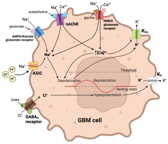 Hundreds of ion channels encoded in the mammalian genome are specialized into multiple isoforms that cover a broad spectrum of properties, allowing the tailoring of channel subtypes into precise physiological roles meeting cell-specific needs, and thus prompting keen interest in this class of proteins as drug targets. The expression of excitatory ion channels such as ASICs, nAChRs and GluRs in GBM cells appears to exacerbate GBM invasiveness; however, overdriving the membrane depolarization phase is deleterious to GBM (as it is in other cells), as was shown using pharmacological blockers of KCa channels, which induced cell death in glioma-initiating cells and improved the survival of mice in an orthotopic model of human GBM [219]. Handicapping KCa channels and GABAARs to interfere with repolarization [220,221,222] would be an intriguing area to explore in future work, identifying more targets for candidate GBM therapies.