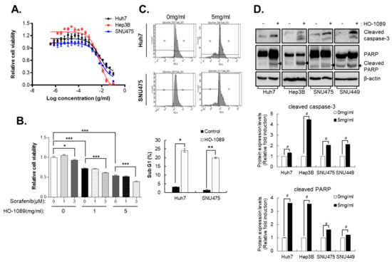 Apoptosis induced by HO-1089 treatment. (A) Huh7, Hep3B, and SNU475 cells were treated with HO-1089 for 48 h beginning with 50 mg/mL and using sequential 2-fold serial dilutions. Cell viability was measured by the number of cell nuclei. (B) The viability of Huh7 cells treated for 48 h with 0, 1, or 3 µM sorafenib or 0, 1, or 5 mg/mL HO-1089 alone or together. (C) The percentage of sub-G1 populations in Huh7 or SNU475 cells treated for 48 h with 0 or 5 mg/mL HO-1089 was determined by flow cytometry. (D) Cleaved caspase-3 and cleaved PARP, which indicate apoptosis, were identified by immunoblots (upper panel) in Huh7, Hep3B, SNU449, and SNU475 cells treated for 48 h with 5 mg/mL HO-1089. The Western blot images were quantitatively analyzed (lower panel). Data are expressed as the means ± SD (n = 3). * p < 0.05, ** p < 0.005, # p < 0.0005, *** p < 0.0001 compared to the control group.