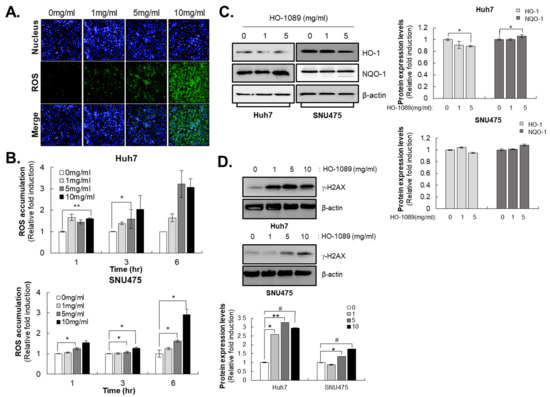 DNA damage by ROS accumulation induced by HO-1089 treatment: (A,B) Huh7 cells were treated with HO-1089 concentrations of 0, 1, 5, or 10 mg/mL for 24 h. ROS were detected with CM-H2DCFDA staining and analyzed using an HCS system. ROS intensity was measured and calculated. (C) The expression of antioxidant-related proteins was examined in 0, 1, or 5 mg/mL HO-1089-treated Huh7 and SNU475 cells (left panel). The Western blot images were quantitatively analyzed (right panel). (D) DNA damage-related protein, r-H2AX, was detected in 0, 1, 5, or 10 mg/mL HO-1089-treated Huh7 and SNU475 cells (upper panel). The Western blot images were quantitatively analyzed (lower panel). Results were normalized to control values to obtain values for relative fold induction. Data are expressed as means ± SD (n = 3). * p < 0.05, ** p < 0.005, # p < 0.0005 compared to the control group.