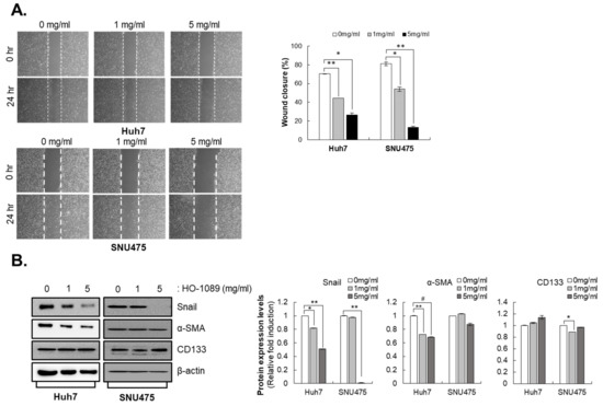 Inhibition of metastasis capacity by HO-1089 treatment: (A) Migration capacities of Huh7 and SNU475 cells were examined after treatment concentrations of HO-1089 at 0, 1, or 5 mg/mL for 24 h (left panel). The percentage of wound closure, which is calculated the area with no cells using image J software (right panel). (B) The EMT-related proteins, Snail and a-smooth muscle actin (SMA) and liver cancer stemness protein CD133, were detected when Huh7 and SNU475 cells were treated with 0, 1, or 5 mg/mL HO-1089 for 48 h (left panel). The Western blot images were quantitatively analyzed (right panel). Data are expressed as means ± SD (n = 3). * p < 0.05, ** p < 0.005, # p < 0.0005 compared to the control group.